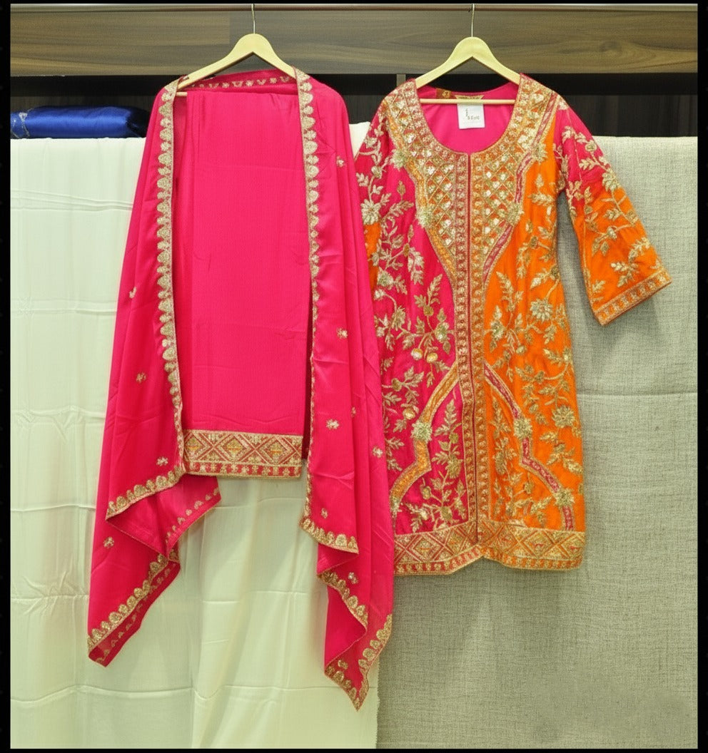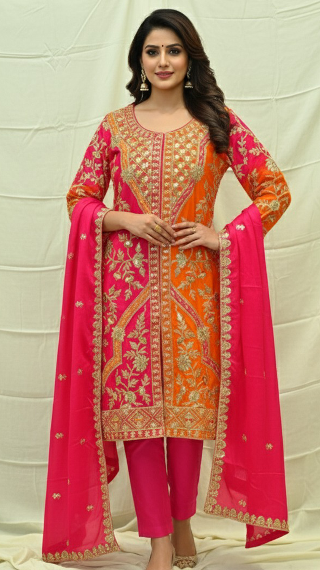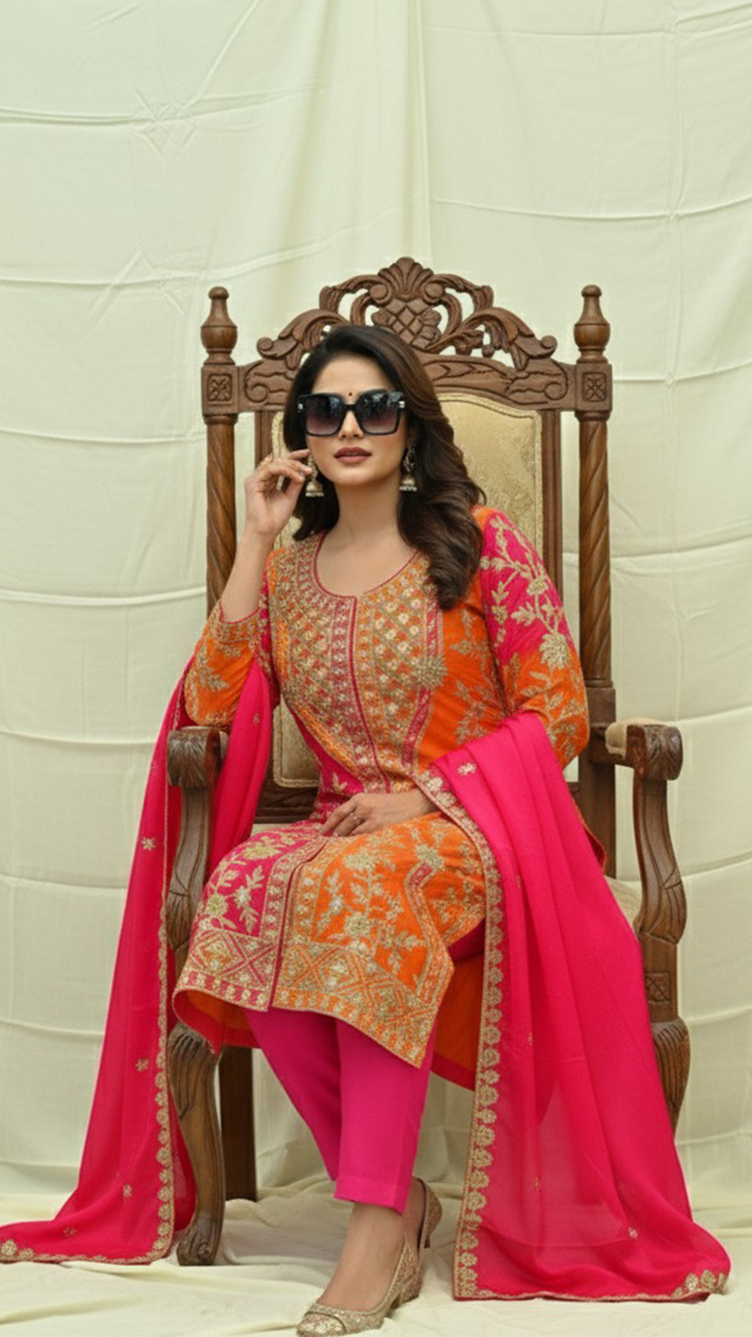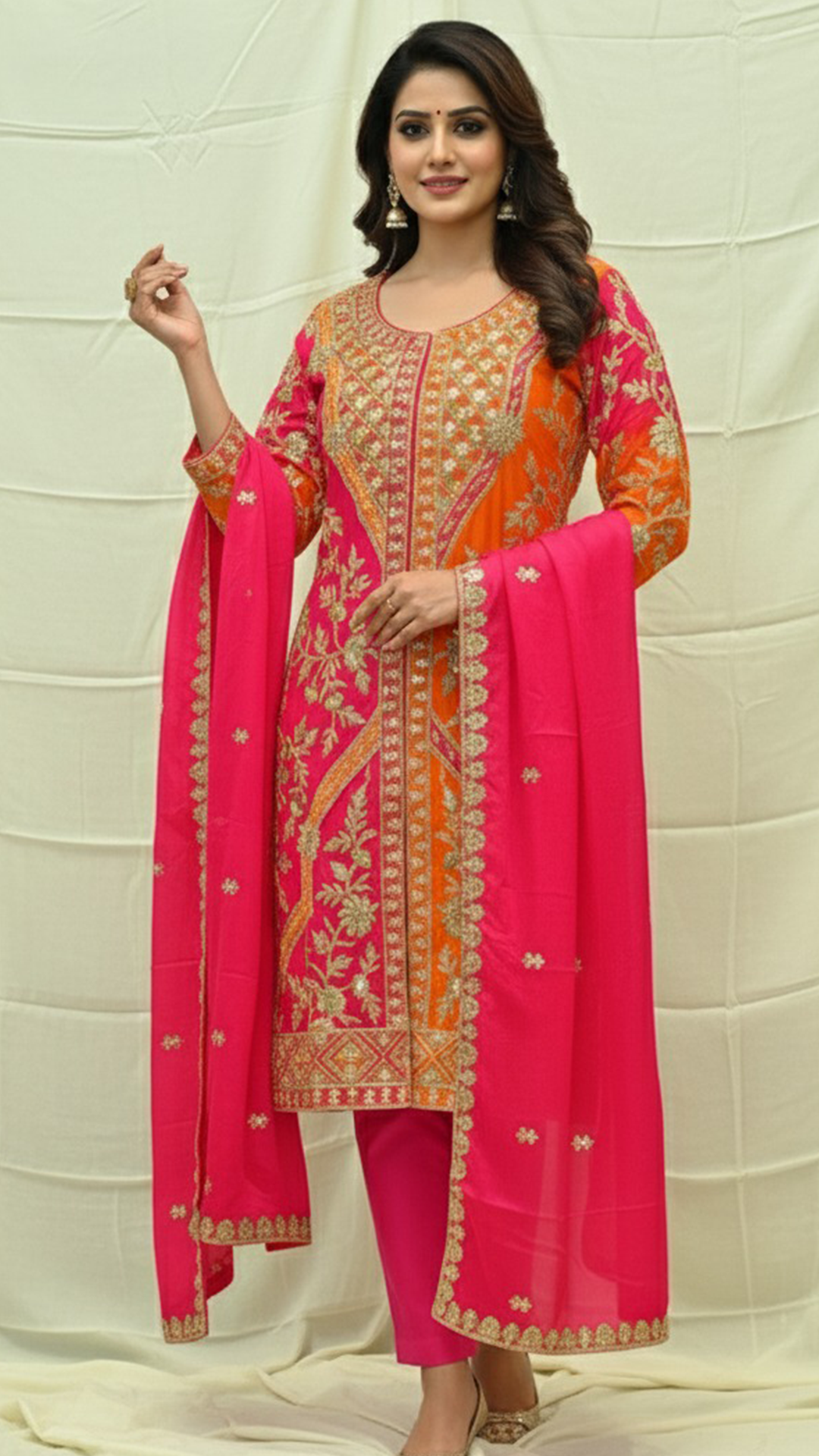 Step into refined elegance with the Chinon Readymade Suit—a lightweight, flowy ensemble designed to make you look effortlessly graceful. Made from premium-quality Chinon fabric, this suit offers a subtle sheen and silky texture that instantly elevates your style. Whether you're attending a festive function, a formal dinner, or a cultural event, this suit will keep you looking poised and polished throughout.